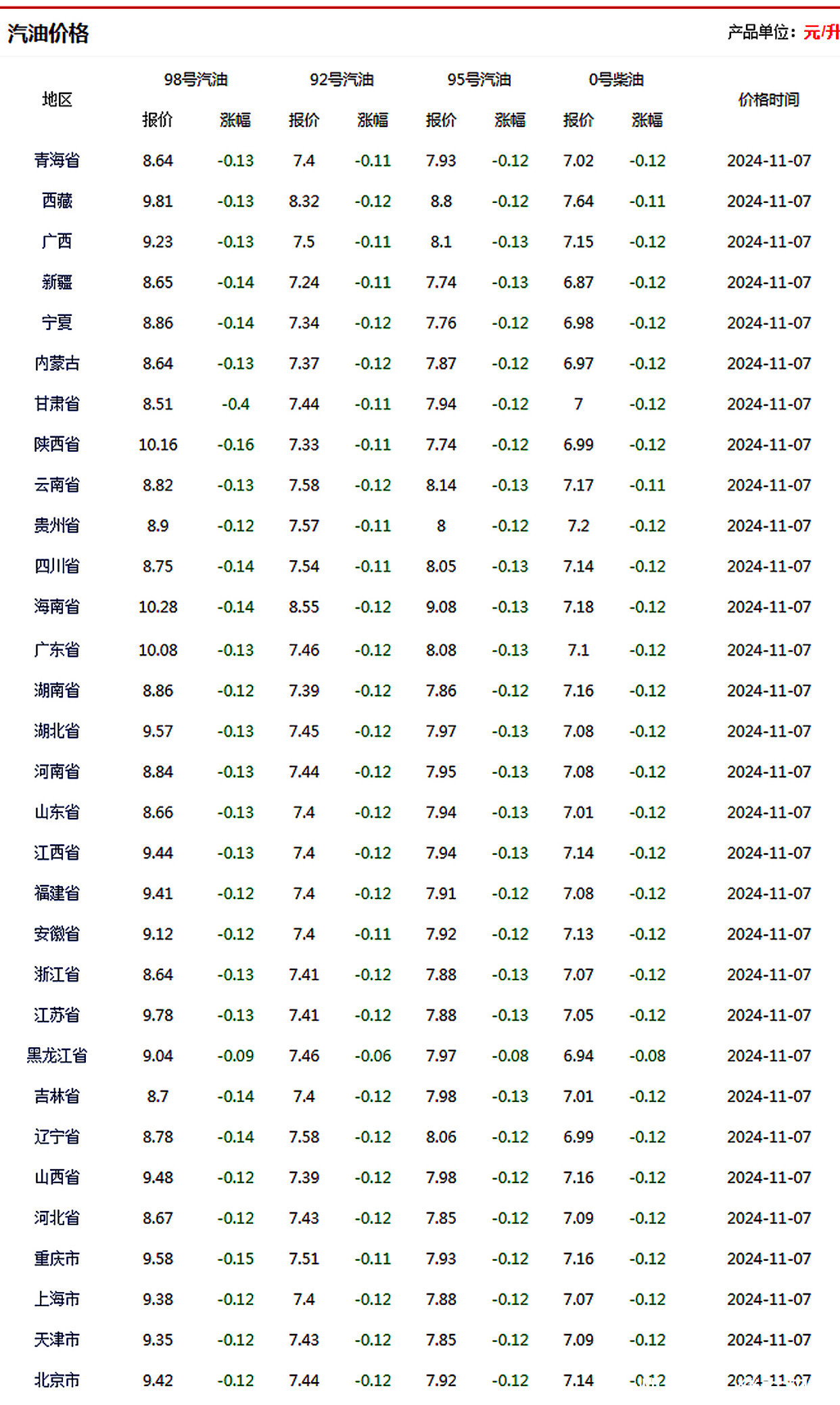 制品油市集:时光流逝,12月渐入中下旬,在国内制品油方面,由于11月20日以及12月4日,聚会两次制品油调价,汽柴油调节幅度不及50元/吨,油价呈现抓续搁浅的模式,因此,按照汽柴油价钱酿成机制,12月5日~12月18日,在此之间,寰宇各地加油站92,95号汽油以及0号柴油等,报价仍按照11月6日,四季度最近一次调价后的水平实施,其中,主流92号汽油报价回落至7.5元/升以下,具体报价汇总参考下图。